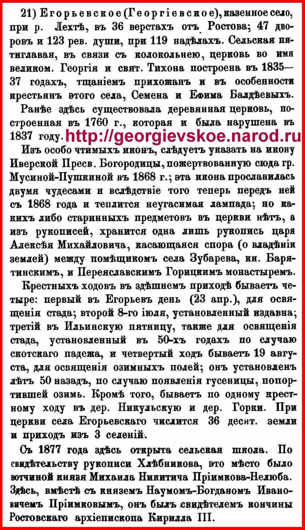 Из ценнейшей уникальной старинной ДОсоветской книги "ИСТОРИКО-СТАТИСТИЧЕСКИЙ ОБЗОР ЯРОСЛАВСКОЙ ЕПАРХИИ" (автор - сын Ярославского Священника ПЛАТОНА КРЫЛОВА - АПОЛИНАРИЙ ПЛАТОНОВИЧ КРЫЛОВ, типография ГЕРМАНА ФАЛЬКА, г. Ярославль, 1861 год, 902 страницы – эту книгу скачать можно по адресу, указанному на её обложке) УСТАНОВЛЕНО, что в 1861 году (а это год отмены Крепостного Права) село ГЕОРГИЕВСКОЕ> http://georgievskoe.narod.ru