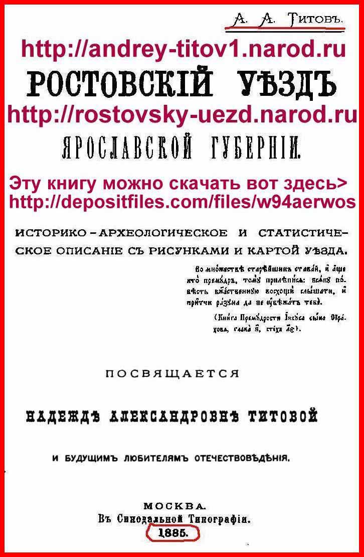Полностью ценнейшую уникальную старинную ДОсоветскую книгу "ИСТОРИКО-СТАТИСТИЧЕСКИЙ ОБЗОР ЯРОСЛАВСКОЙ ЕПАРХИИ" (автор - сын Ярославского Священника ПЛАТОНА КРЫЛОВА - АПОЛИНАРИЙ ПЛАТОНОВИЧ КРЫЛОВ, типография ГЕРМАНА ФАЛЬКА, г. Ярославль, 1861 год, 902 страницы) скачать можно здесь > http://dfiles.ru/files/s8aw3q02w (клИкайте на изображение ниже что бы СКАЧАТЬ эту книгу ПОЛНОСТЬЮ):